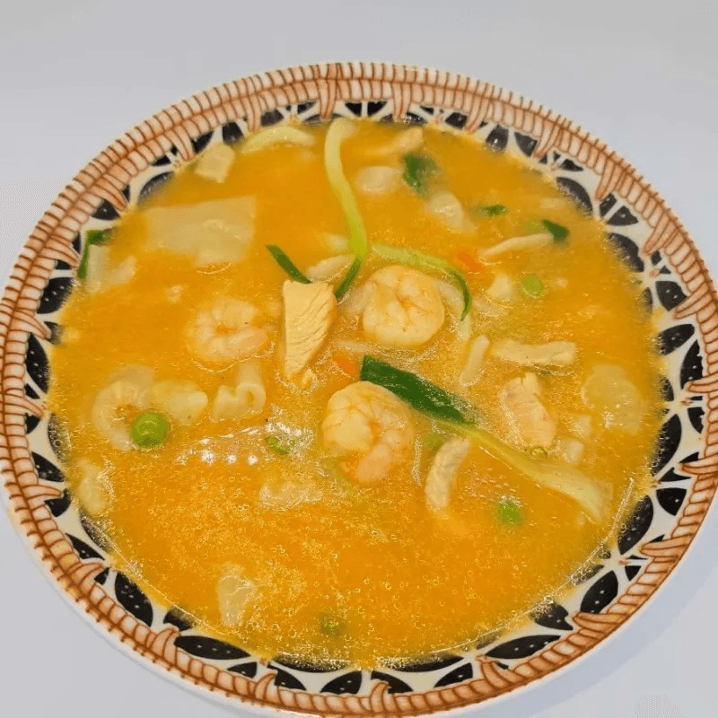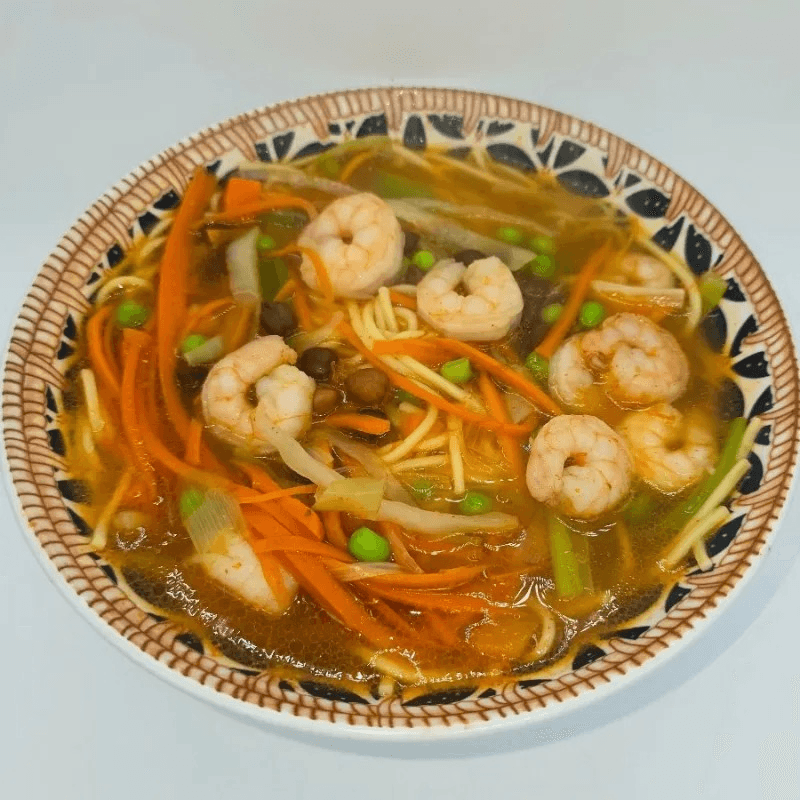 Boiled noodle soup typically mixed with shrimp, cilantro, cabbage, carrot, and potatoes