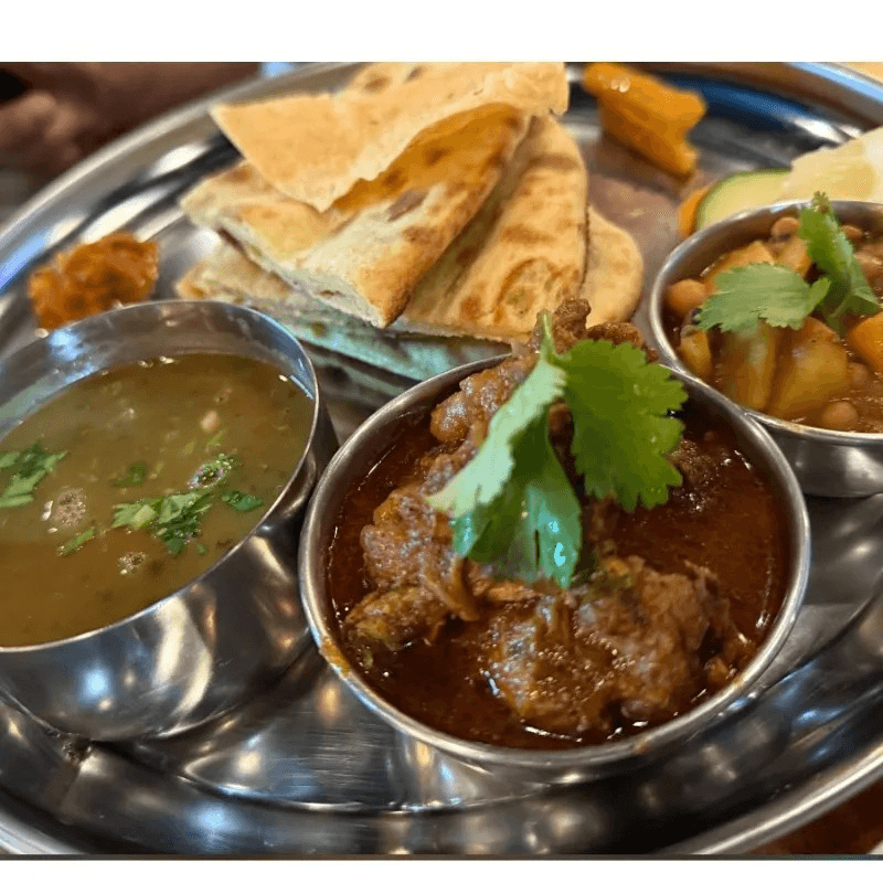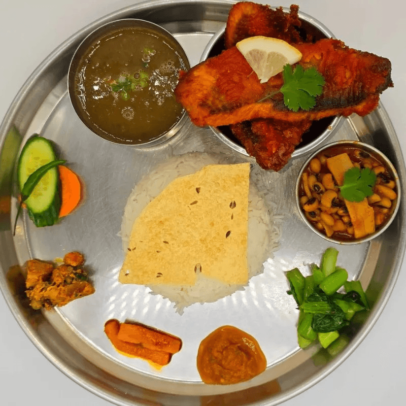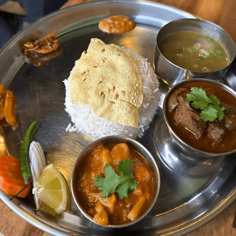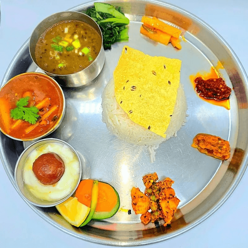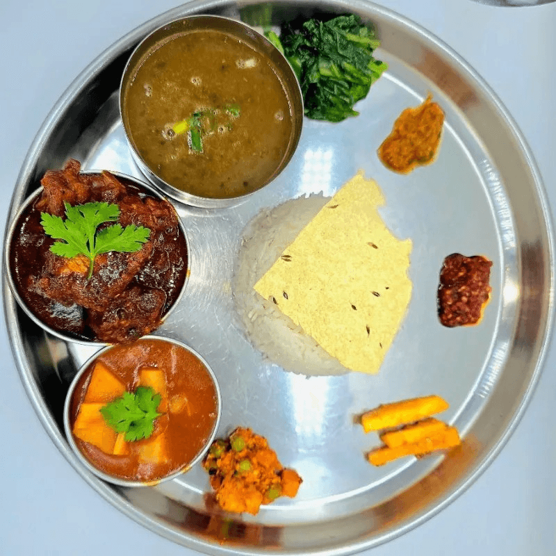 Traditional Nepali platter served with rice, mustard greens ,vegetable curry. Papad, lentil soup, chutney