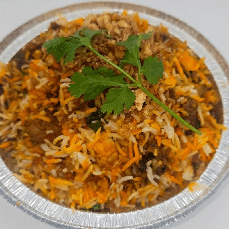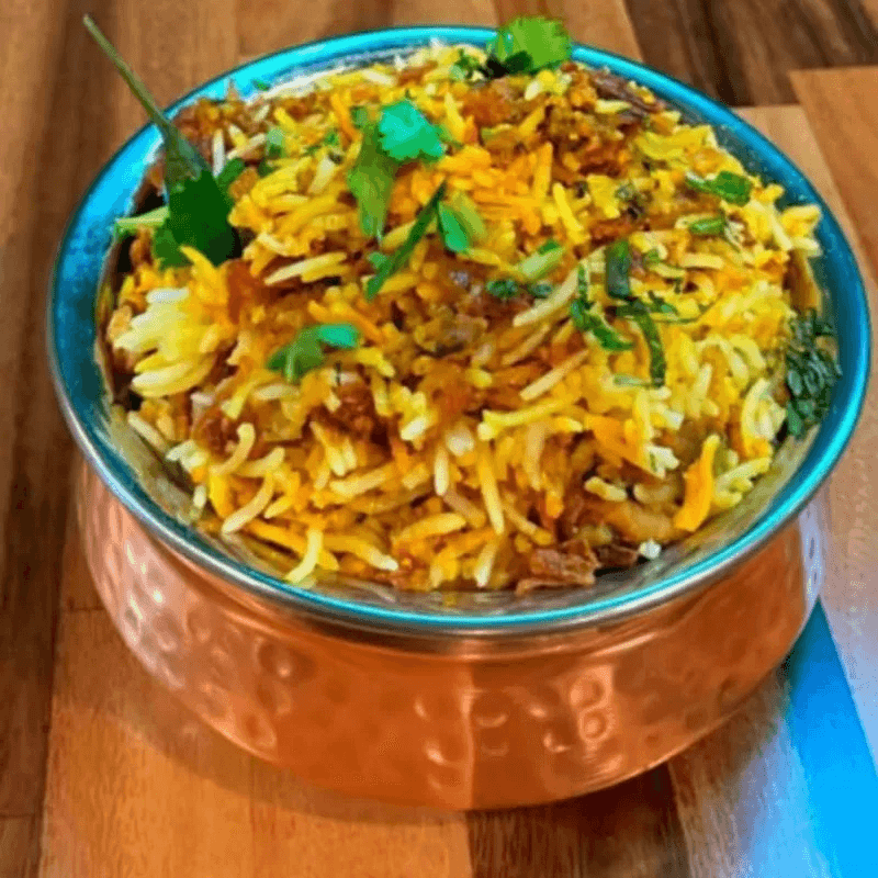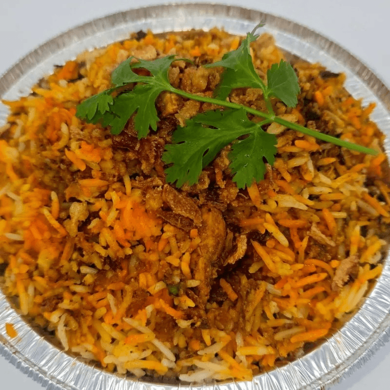 Aromatic basmati rice layered with spiced chicken, garnished with fried onions and herbs. Comes with a steamed basmati rice