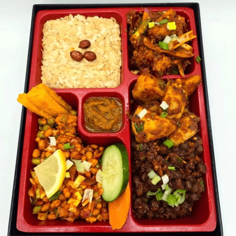 Lean goat meat jerky, basmati rice, mixed lentils, vegetable curry, pickles, papad, and yogurt