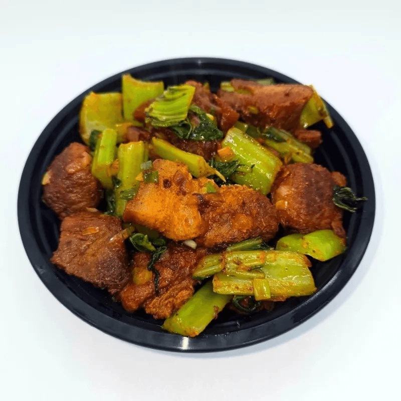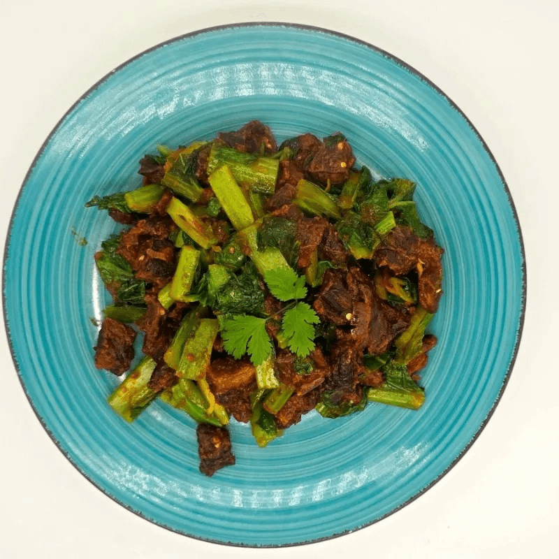 Boneless pork with mustard greens made with traditional style straight from the Himalayas