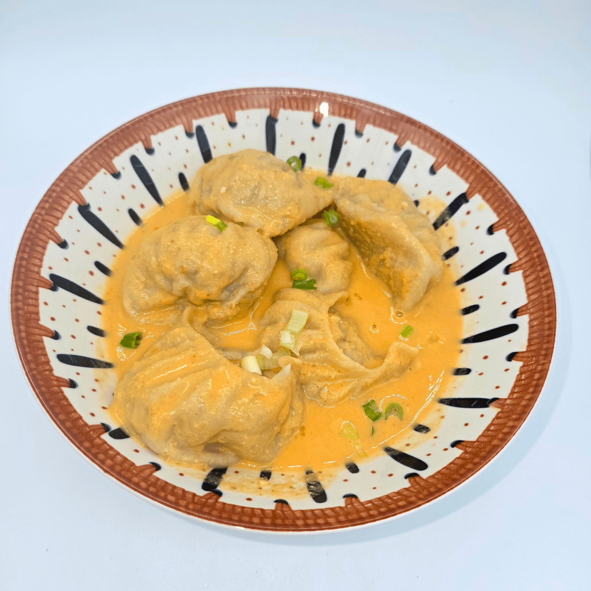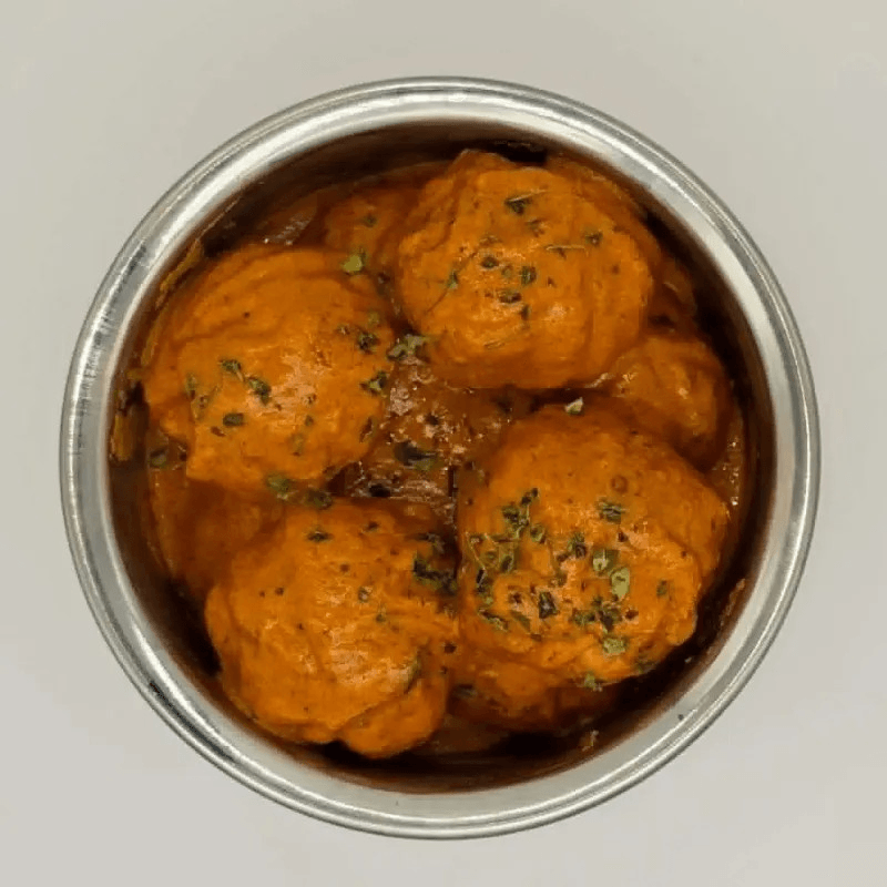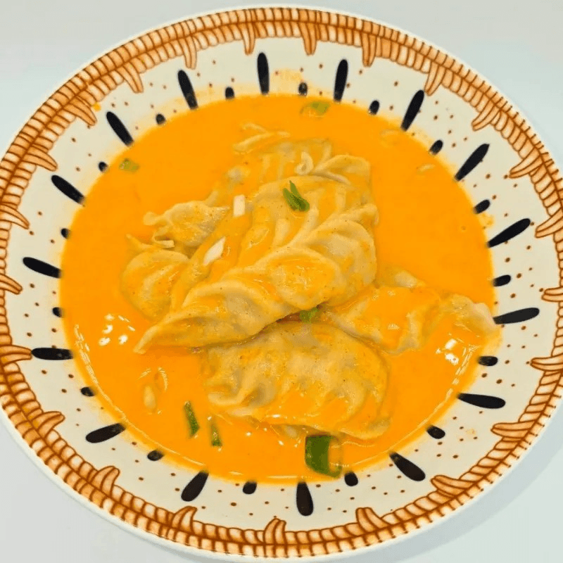 Hand-wrapped steamed dumplings stuffed with beef, green onions, and cilantro, sautéed in a creamy butter masala sauce with tomatoes and onions