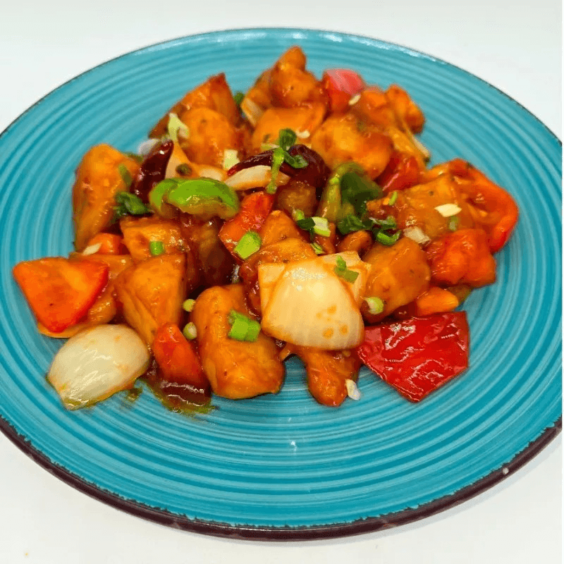 Tender Pork meat sautéed with red & green bell peppers & tomatoes in chilli sauce.