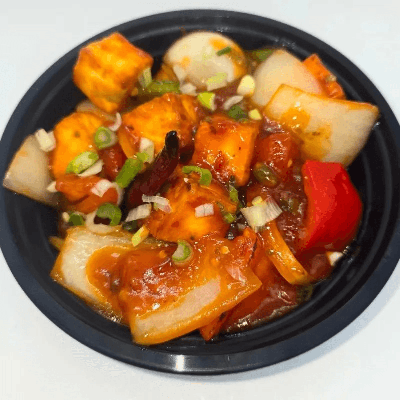 Fried cottage cheese cubes sautéed with red & green bell peppers & tomatoes in chili sauce