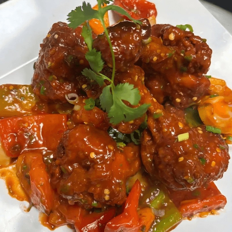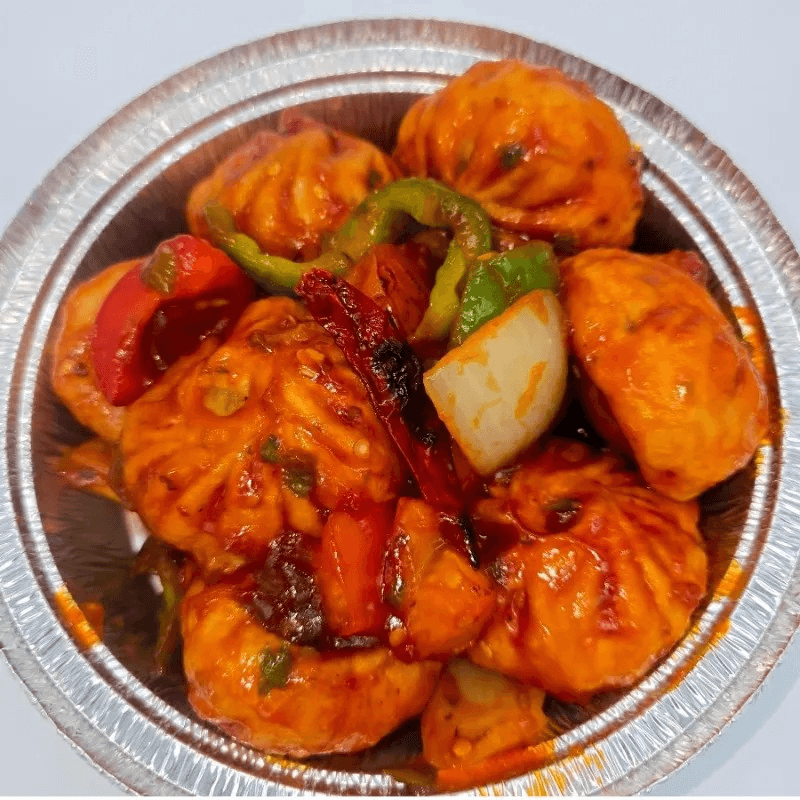 Steamed vegetable dumplings sautéed with bell pepper, onion, and a tangy chili sauce