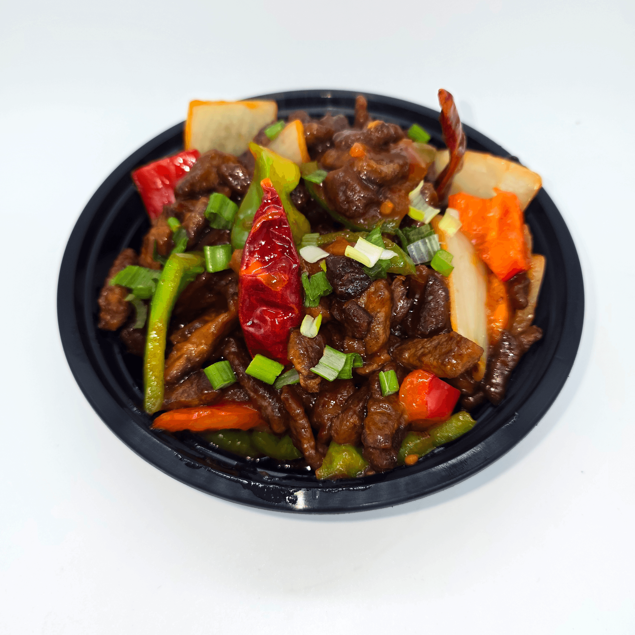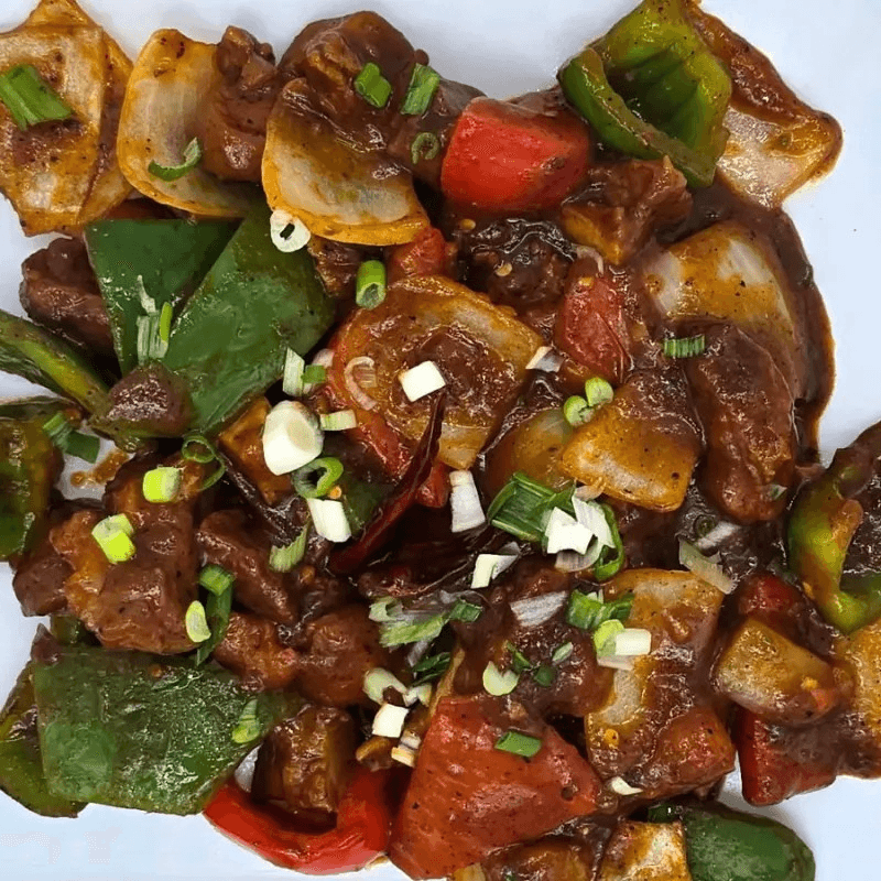 Tender beef meat sautéed with red & green bell peppers & tomatoes in chilli sauce