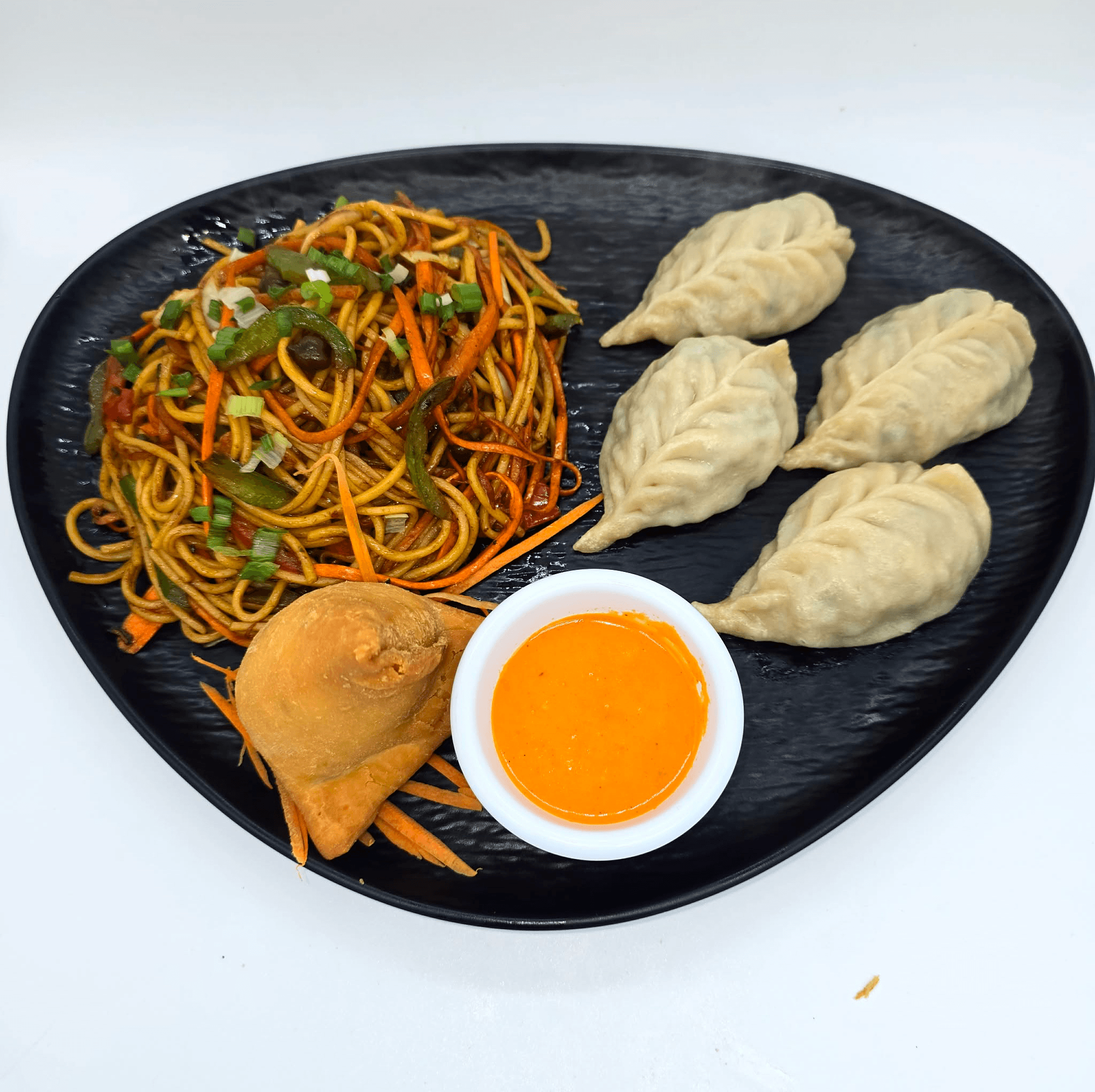 Steamed veggie momo (4 pieces) & veg chow mein comes with veggie samosa (1 piece)