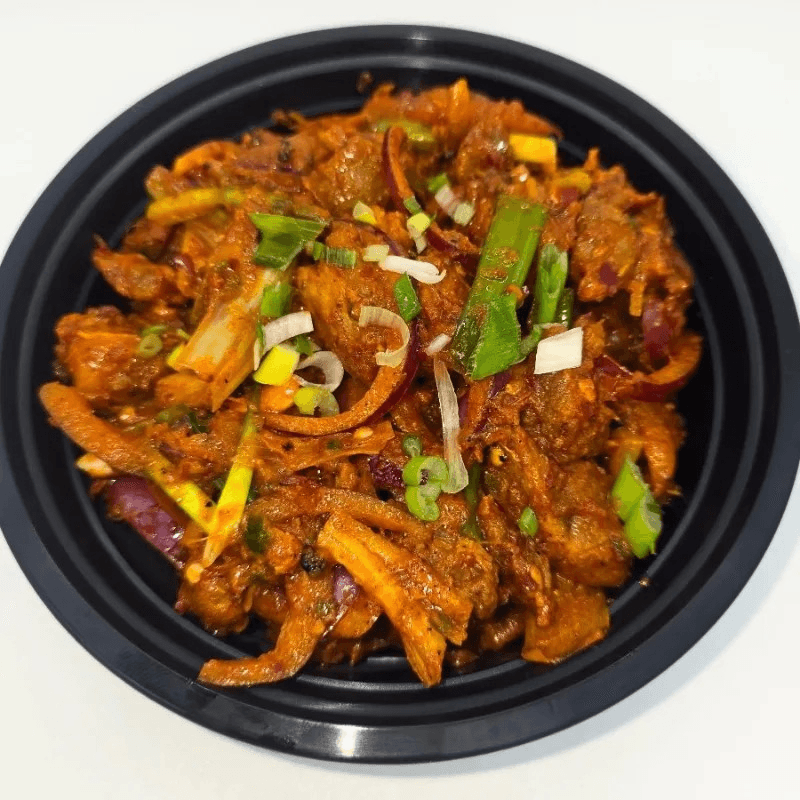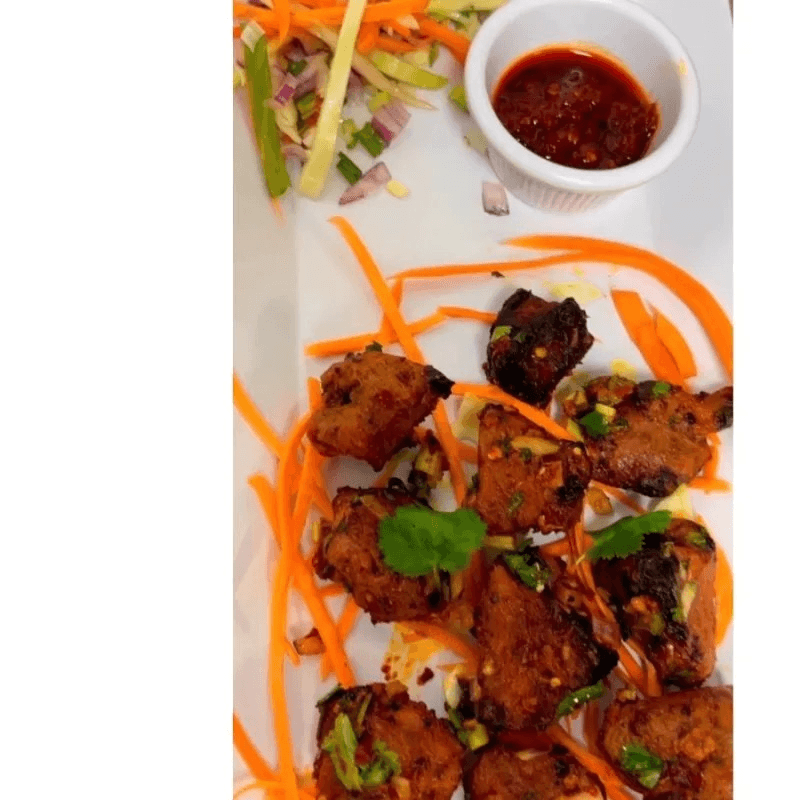 Cooked in clay oven pork marinated in Himalayan spices and herbs, mixed with special sauce, onions, and chili