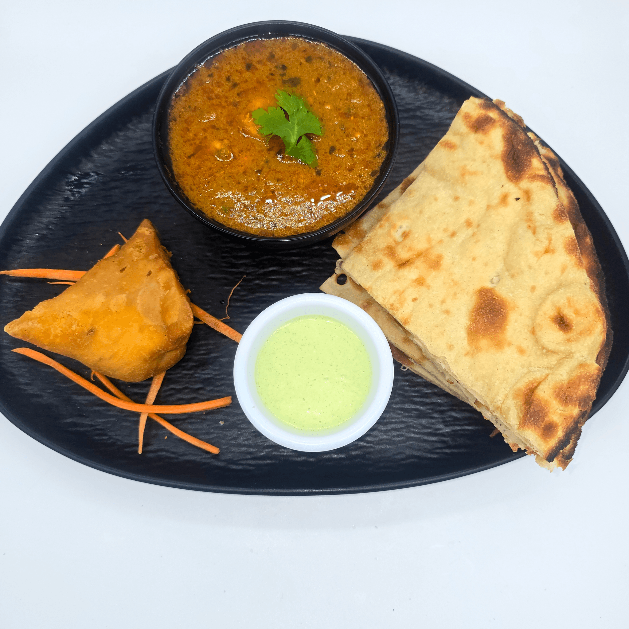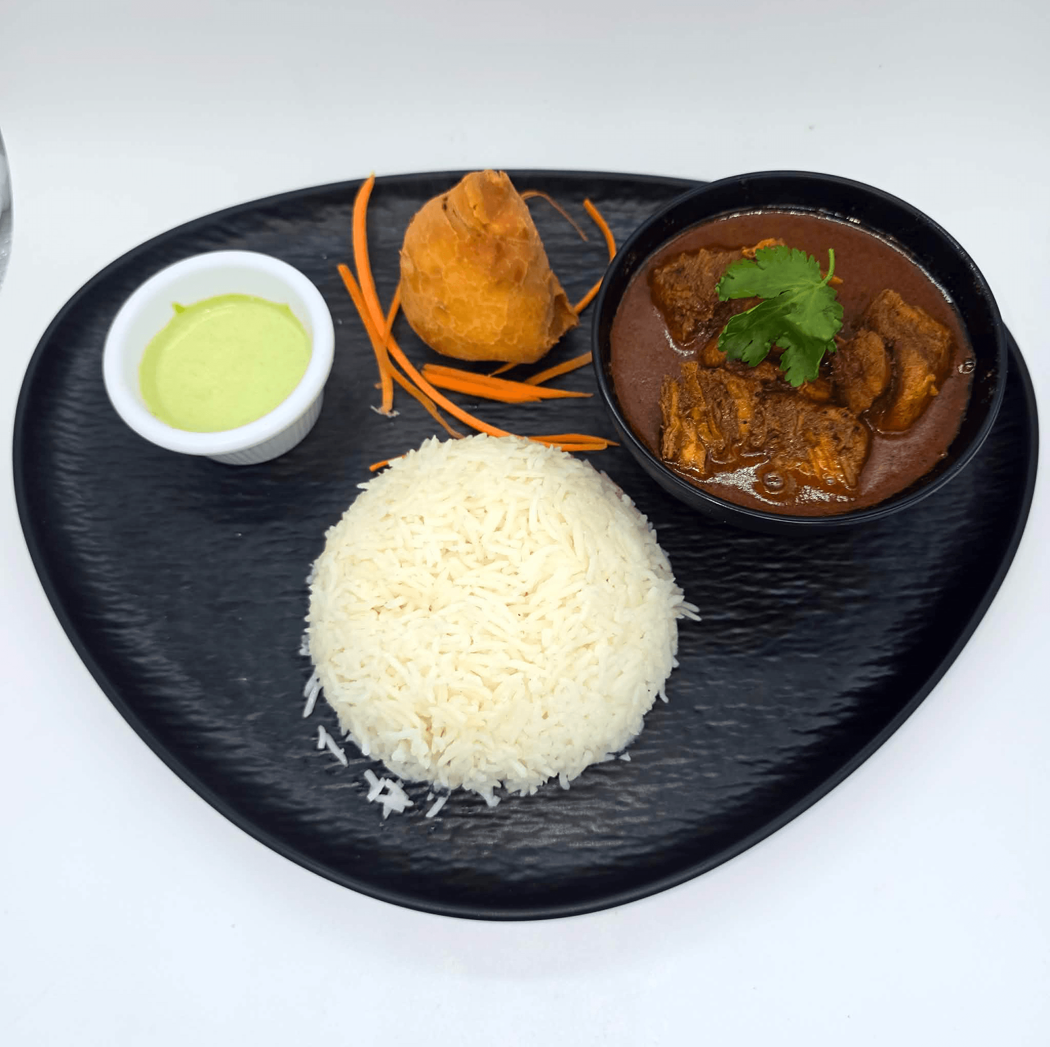 Comes with choice of (rice or plain naan) & (veggie samosa 1 piece)