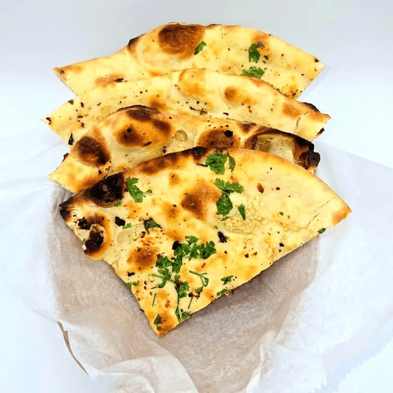 A type of flatbread naan, baked in a tandoor clay oven with extremely high heat, giving it a unique smoky flavor, puffed texture, and charred spots topping of minced garlic, melted butter, and often fresh cilantro.