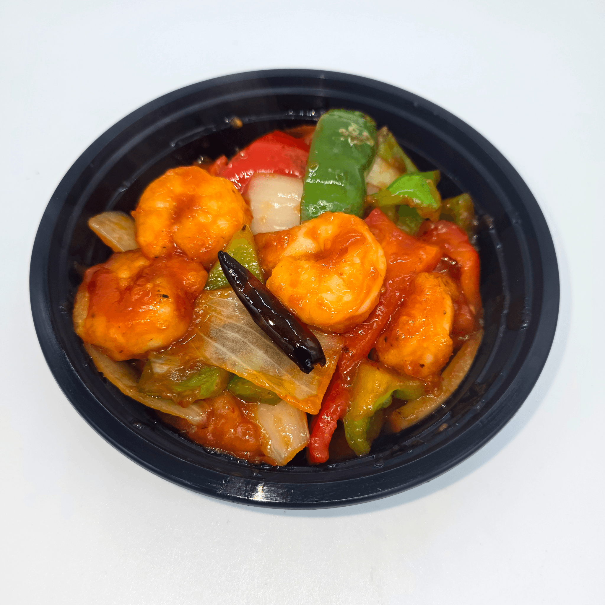 Batter-fried shrimp sautéed with tomato, onion, and green chilies in a spicy chili sauce