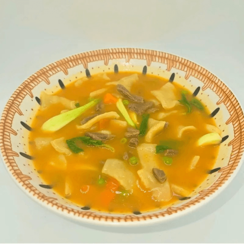 Handmade pasta and clear stock soup with tender beef, turnips, baby spinach, potatoes, broccoli, and seasonal vegetables
