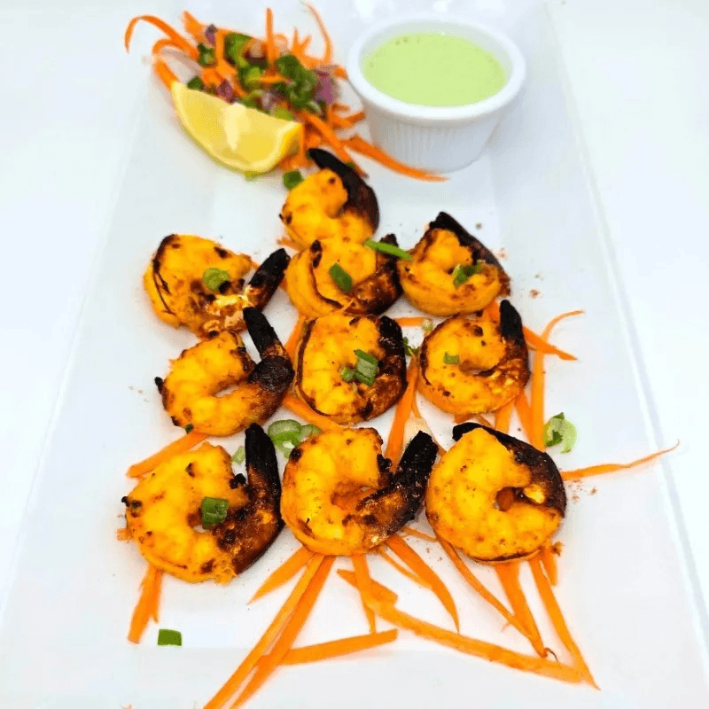 Tandoori shrimp: Shrimp marinated in yogurt and spices, roasted in a clay tandoor oven