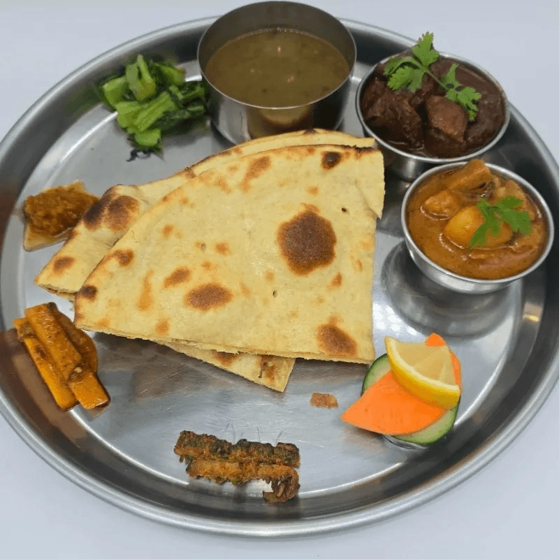 Traditional Nepali platter served with roti, mustard green, vegetable curry, papad, lentil soup, chutney