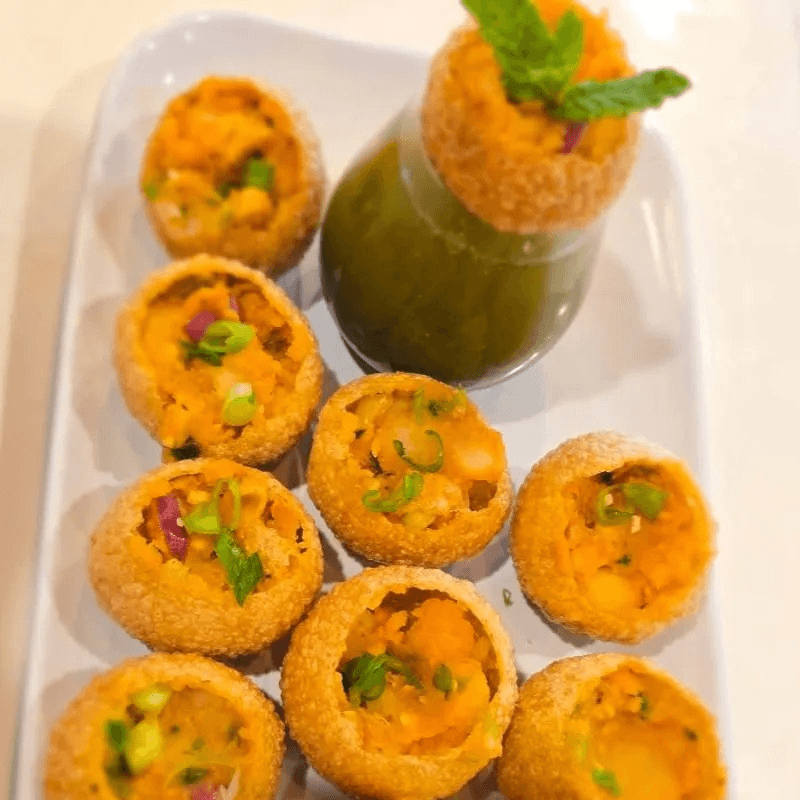 Crisp hollow shells with tangy tamarind sauce, chickpeas, and spiced potatoes
